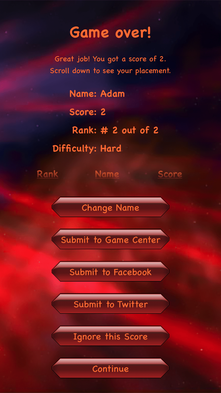 Tracks high scores and previous scores for each difficulty setting. Post your scores to Apple Game Center leader boards and see how you compare with other players. Earn up to 40 different achievements.